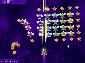 To help players in their battles against the chicken menace, power-ups and upgrades are available throughout the game. With increased maneuverability and powerful weapons, players can compete with others worldwide through the game's online leaderboards.